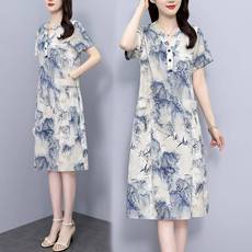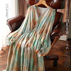 2025夏文艺复古真丝印花大码连衣裙女装气质洋气中年妈妈过膝长裙