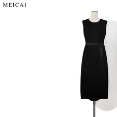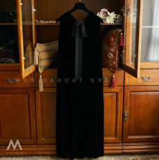 大品牌外贸撤柜女装优雅后领飘带真丝丝绒黑色无袖背心及踝连衣裙