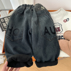 男童加绒牛仔灯笼裤冬季保暖一体绒束脚裤儿童宝宝卡通宽松哈伦裤