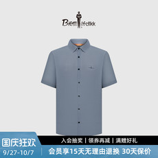 虎豹夏季男士纯色短袖衬衫蓝色涤棉易打理商务休闲合身男衬衣