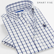 时尚商务轻熟风胸前图腾刺绣衬衫男短袖修身格子衬衣绣花简约通勤