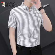 啄木鸟夏季2025薄款衬衫男短袖商务纯棉免烫休闲上衣修身条纹翻领