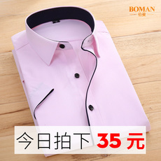 伯曼夏季粉色青年男士修身韩版衬衫纯白短袖结婚伴郎商务休闲衬衣