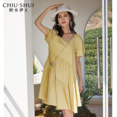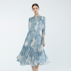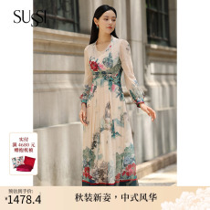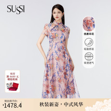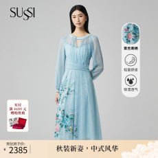 SUSSI/古色秋商场同款雪纺度假新中式收腰百搭显瘦皇后领连衣裙女