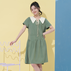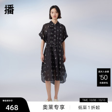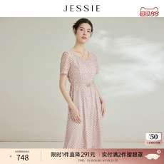 【商场同款】JESSIE气质印花领系带收腰中长款短袖连衣裙女春夏新