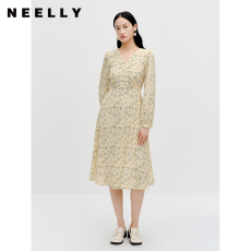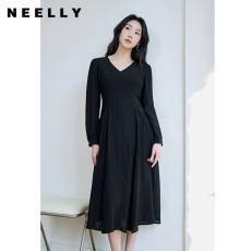 NEELLY纳俪商场同款黑色连衣裙女气质v领中长款A字裙夏季新款
