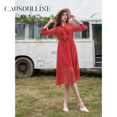 高斯雪岚2024春新款蝴蝶结波点雪纺连衣裙度假风显瘦a裙商场同款