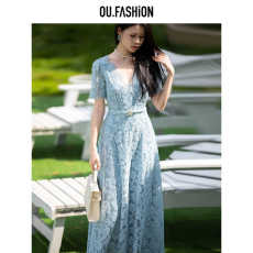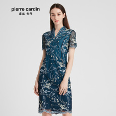 商场同款皮尔卡丹女装夏季新款蓝色短袖蕾丝连衣裙淑女裙