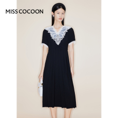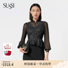 SUSSI/古色春商场同款黑色蕾丝拼醋酸贴花中长款鱼尾连衣裙礼服
