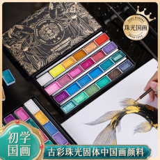 鲁本斯珠光固体国画颜料初学者套装24色金银闪光美术生专用矿物颜料中国画水彩点缀书法练习美甲晕染唐卡描金