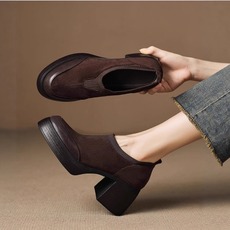 圆头粗跟深口单鞋女一脚蹬拼接厚底高跟乐福鞋小个子英伦风小皮鞋