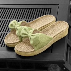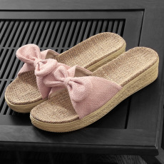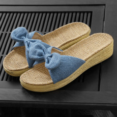 蝴蝶结坡跟女士亚麻拖鞋厚底高跟可外穿夏季室内家居家用凉拖鞋女
