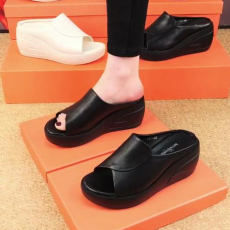 永佰利[凉拖断码]夏季牛皮女拖鞋休闲舒适真皮坡跟松糕底高跟鞋