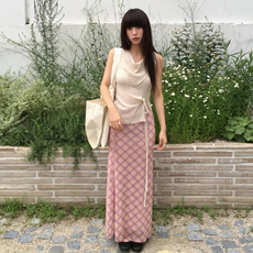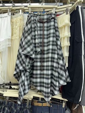 复古辣妹风休闲美式小众设计感高腰不规则撞色格纹磨毛半身长裙女
