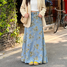 2025秋季大码胖mm复古花卉碎花牛仔半身裙女高腰A字宽松显瘦长裙