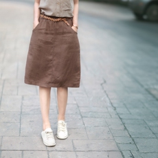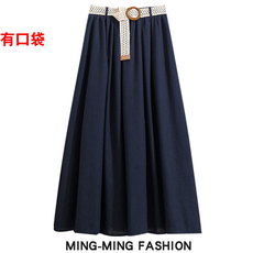 复古编织带亚麻大摆半身裙夏季2025新款高腰显瘦A字中长裙子口袋