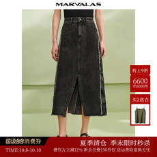 曼德诗全棉半身裙2025夏新款复古直筒牛仔裙开叉裙摆设计中长裙