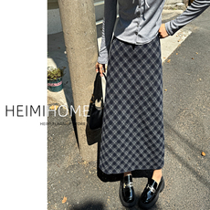 复古毛呢格纹裙女秋冬季高腰羊绒直筒长裙学院风开叉格子裙半身裙