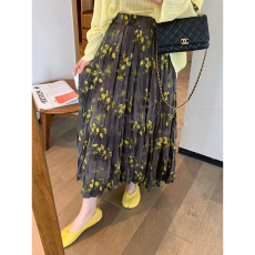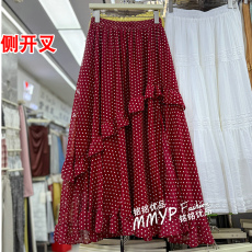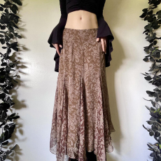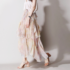 C36低饱和度复古淡色印花层叠不规则荷叶边松紧高腰法式半身长裙