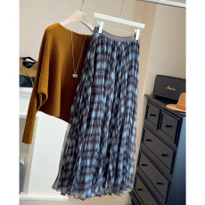 复古格纹垂感压褶网纱半身裙女秋季2025新款高腰过膝百褶中长裙子