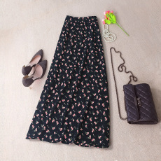 复古碎花半身裙女!夏季韩系百搭松紧腰褶皱显瘦A字休闲长裙黑色
