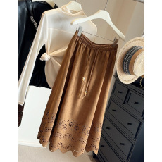 复古麂皮绒A字半身裙女2025秋冬季新款时尚抽绳设计镂空中长裙子