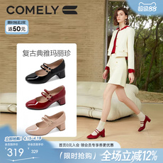 康莉粗跟玛丽珍鞋女春秋新款漆皮亮面圆头复古拼接高跟小皮鞋鞋子