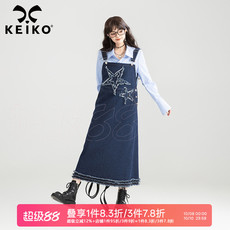 KEIKO艺术感复古牛仔背带裙25早秋小众设计印花遮肉显瘦a字连衣裙