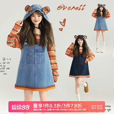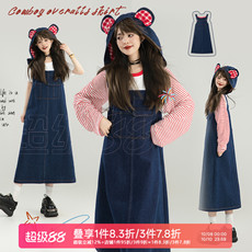 KEIKO [可卸帽] 俏皮风减龄牛仔背带长裙秋日叠搭复古显瘦连衣裙
