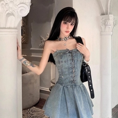 自制甜酷美式复古牛仔甜辣抹胸连衣裙少女收腰显瘦公主蓬蓬裙短裙