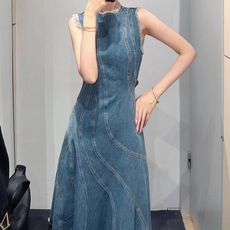 2025春季法式复古拼接牛仔蓝色无袖连衣裙气质收腰显瘦海边度假裙