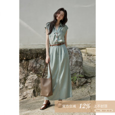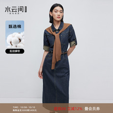 周里物/深蓝色连衣裙女2025春季新款宽松中裙配腰带复古牛仔裙子