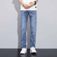 夏季薄款男士牛仔裤男直筒修身浅蓝色弹力裤子男加长水洗中腰长裤