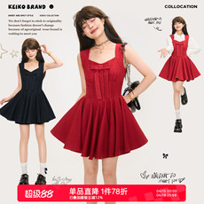 DPLAY红色方领法式连衣裙2026夏季新款腰部褶皱气质礼服裙小礼服