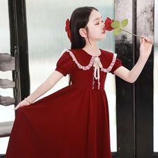 25夏季新款女童短袖连衣裙儿童红色公主裙娃娃领不规则时尚公主裙