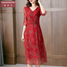 2021新款妈妈装夏装洋气女士短袖红色雪纺连衣裙中长款显瘦大摆