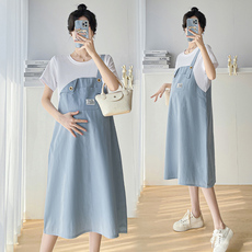孕妇夏装连衣裙中长款甜美减龄孕妇装夏天刺绣雪纺圆领显瘦裙子女