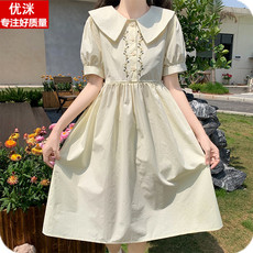 娃娃领重工刺绣蕾丝收腰短袖连衣裙大童少女夏季初中高中学生裙子