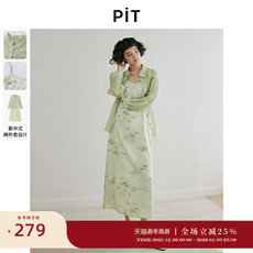 PIT复古绿色天丝衬衫吊带裙子两件套女夏季新款国风长裙套装