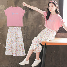 女童夏季短袖新款运动风T恤套装洋气中大童半身休闲长裙两件套潮