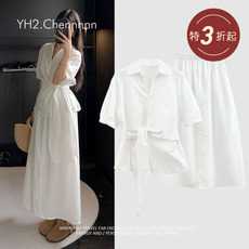 紫涵简约衬衫连衣裙套装女夏季新款休闲甜美衬衣无袖中长裙两件套