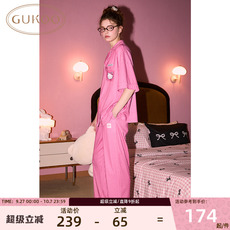 Gukoo/果壳女睡衣短袖长裤翻领Hellokitty春夏棉条纹情侣家居服套