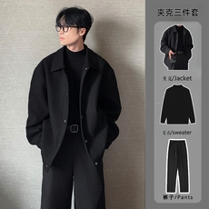 韩系翻领毛呢夹克套装男秋冬季轻熟风呢子外套男装搭配休闲三件套