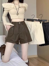 PU皮短裤女2023秋冬季新款高腰显瘦外穿宽松阔腿a字休闲打底靴裤