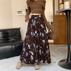 法式复古褶皱印花半身裙女2025秋冬新款梨型身材遮胯裙子大摆长裙