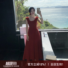 pusumede 复古大U领无袖背心连衣裙女夏季收腰显瘦大摆气质长裙子