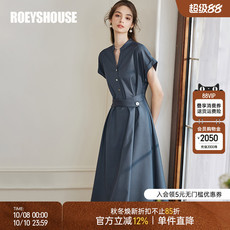 罗衣时尚通勤深蓝色连衣裙女2025夏季新款优雅系带大摆裙子10222