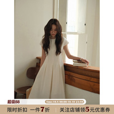 JOCO CHIC白色气质褶叠收腰大摆连衣裙女2025夏季宽松简约a字长裙