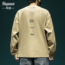 重磅纯棉长袖t恤男士宽松大码潮牌新款美式复古山系印花休闲体恤