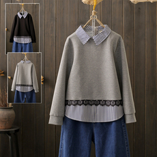 春秋大码200斤假两件长袖卫衣女女polo领条纹拼接宽松减龄上衣潮